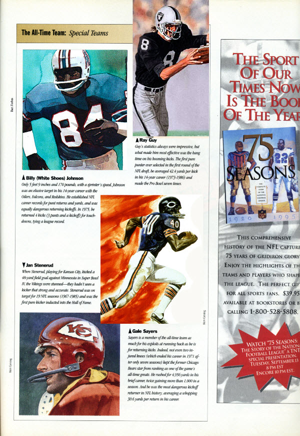 In 1994 Ray Guy and Jan Stenerud were the punter and kicker, respectively and Billy "White Shoes" Johnson was the return specialist.